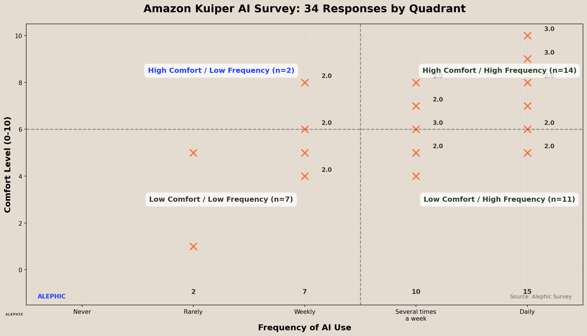 Analysis of 34 Amazon Kuiper team members reveals strong AI adoption with 44% daily usage and 6.5/10 average comfort level. Key barriers include Amazon's limited toolstack, security concerns, and prompting expertise gaps.